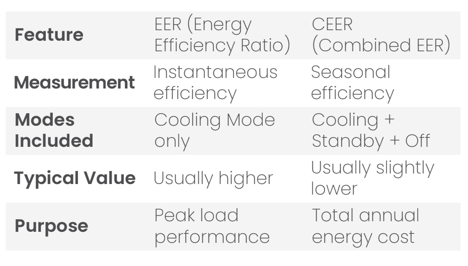 The Combined Energy Efficiency Ratio (CEER) is the standard metric for measuring the energy efficiency of room air conditioners. Unlike the older EER, which measured efficiency only while the unit was cooling, CEER accounts for energy consumed when the unit is in standby or off mode.