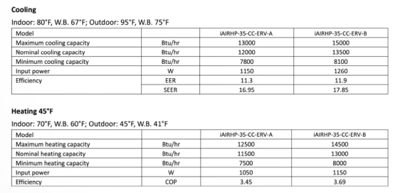 Inspiron Air misrepresents even the fake numbers it publishes for iAIRHP-35-CC and -iAIRHP-35-CC-ERV in both heating and cooling, as the math doesn’t add up.