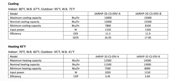When tested in a lab, the Inspiron Air iAIRHP-35-CS and -iAIRHP-35-CS-ERV will not produce 12,000 BTU at a 16.95 SEER rating, as claimed. The actual numbers they claim are fake.